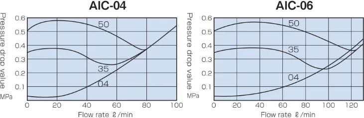 AIC-02/03 流量-圧力降下特性AIC-04/06 流量-圧力降下特性